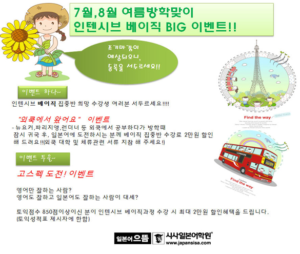 7월8월 방학맞이 인텐시브 베이직 BIG 이벤트"등록을 서두르셔야만 합니다"