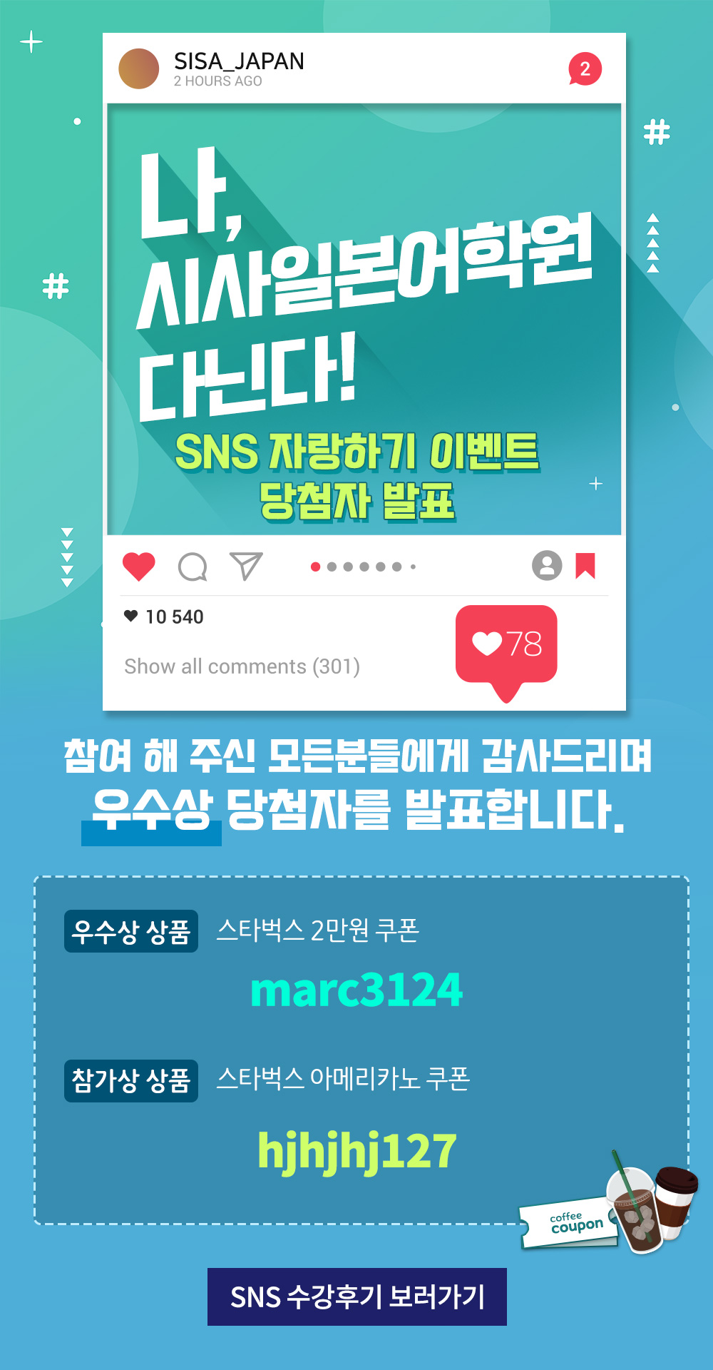 나, 시사일본어어학원 다닌다! 7월 SNS 자랑하기 이벤트 당첨자 발표