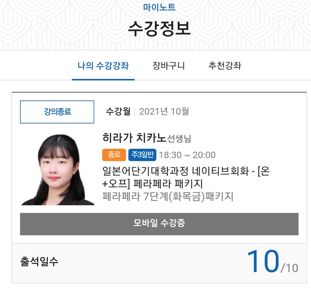 | 3518 | 종로 | JIP 네이티브회화 | 페라페라 패키지 - ·페라페라 10단계(화목금) | 히라가 치카노 |
