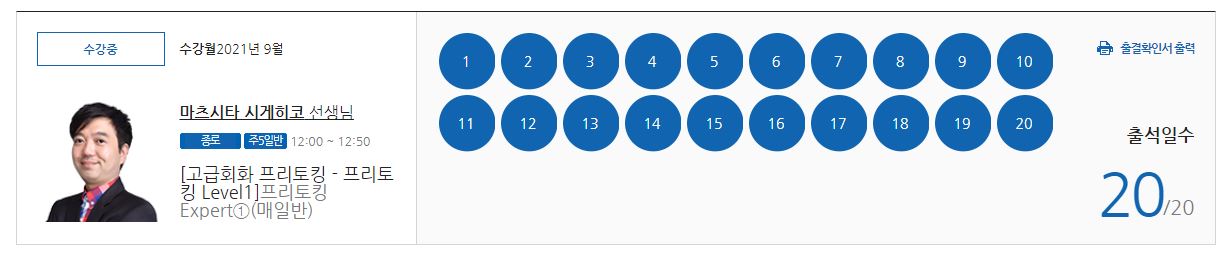 | 1419 | 종로 | 일본대학 진학과정 (EJU) | 고급프리토킹 - * 프리토킹 Expert①(매일반,50분/20회) | 마츠시타 시게히코 |