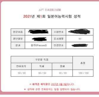 정말 합격 통지 받자 마자 작성합니다. 선생님 정말정말 감사합니다. 코로나로 시험이 계속 취소되어 작년부터 중간중간 쉬면서 강의를 수강 했지만 선생님이 알려주신 내용 하나하나 쌓아 만들어낸 결과물인 거 같습니다. 작년 처음 N1반을 들었을 때에는 독해를 반도 맞기 힘들어했지만 선생님의 강의를 수강하면서 점점 독해에 자신감이 붙었고 이제는 독해가 강점이라고 자랑스럽게 말할 수 있을 정도로 성장했습니다. 독해 뿐만 아니라 제일 약했던 한자를 가장 효과적이고 효율적으로 암기해 시험에서도 좋은 결과를 이끌어 낼 수 있도록 도와주셨습니다. 마지막으로 실제 시험과 같이 모의고사를 보는 것, 이게 정말 도움이 많이 되었습니다. 시간이 제한되어 있는 시험이기 때문에 시간 배분이 정말 중요한데 실제 시험처럼 시간을 재고 모의고사를 풀어보는 것을 통해 이런 부분도 보완할 수 있었습니다. 단지 시간 배분 뿐만 아니라 속독을 통해 최대한 빠르고 정확하게 답을 찾아낼 수 있는 능력을 가질 수 있게 되어 실제로 시험장에서도 시간이 많이 남아 여유롭게 시험을 치를 수 있었습니다. 이 모든 것을 쌓아 올린 결과 저는 만점이라는 정말 놀랍고도 감사한 점수를 받을 수 있었습니다. 다시 한번 정말 감사드립니다. |