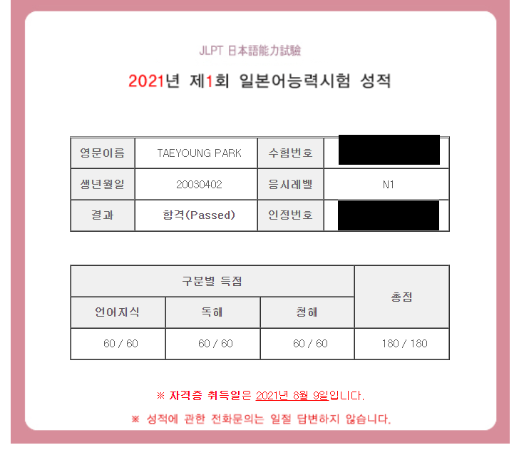 1월부터 6월까지 꾸준히 선생님 수업 듣고 첫 jlpt 시험에 n1 만점 달성했습니다~ 혼자 공부했다면 상상도 못할 점수였는데 선생님 도움으로 만점 받을 수 있었습니다. 반년간 정말 감사했습니다^^ |