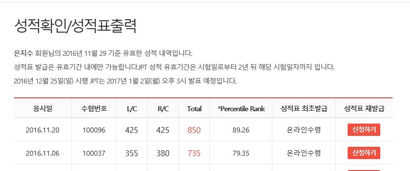 11월부터 한달간 김수빈 선생님 수업을 들은 학생입니다! 600반을 듣다가 800반을 들어보고 싶다는 생각에 김수빈 선생님의 수업을 듣게 되었어요. 선생님 수업을 들은지 얼마 안되서 시험을 쳤을 땐 735점으로 700점은 돌파했지만 뭔가 아쉬움이 커서 20일에 한번 더 쳐보았는데 115점 상승! 김수빈 선생님 수업에서는 명사, 부사, 형용사, 등 프린트로 나누어 주신점도 좋았지만 시험을 친다는 점이 더 좋았어요! 뭔가 한번더 확인한다는 느낌? 거기에 수업시간에 수업하시는 단어도 하나하나 집어주시면서 그 단어와 관련있는 것도 가지처럼 쭉쭉 더 알려주시구 단어 효과를 많이 본 것 같습니다! 800점 돌파의 목표를 11월 마지막 시험에 이루었지만 조금 더 점수를 올리기 위해 한달 더 노력해 보려 합니다! 물론 김수빈 센세와 함께! ^0^ |