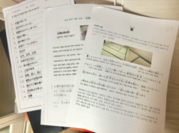 늘 한자 때문에 텍스트를 읽다 막히는 일이 생겨 고생을 했었습니다. 그렇지만 이번 강의를 들으면서 한자의 여러가지 읽는법을 배우게 되어 읽을 수 있는 한자가 늘어나 앞으로 수월할 것 같아요. 간혹 읽는법을 모른다 해도, 한자의 의미도 배웠으니 유추까지도 가능하게 되었습니다! 배운 한자 중, 특히 雨를 '아메' 가 아닌, '사메' 라고 읽는 방법이 신기하고 예쁘다고 생각했어요. 하지만 이번 한자수업은 스스로 복습을 しなければならない이기 때문에 복습도 탄탄히 해야 본인 것으로 만들 수 있습니다!!!!! 아자아자 간바리마스 계속 한자만 하면 힘들 수도 있으니, 선생님께서 일본의 주거문화나, 식문화, 이야기 등등도 가끔씩 설명 해주셨는데 읽어보면 흥미롭고 재미있는 내용도 많아서 좋았어요 그리고 정리된 프린트물도 많이 주셔서 복습할때 편하고 좋았습니다! 사진도 첨부할게요! (수업 내용이라 조금 블러처리 했어요.) 센세 너무너무 감사해요♥