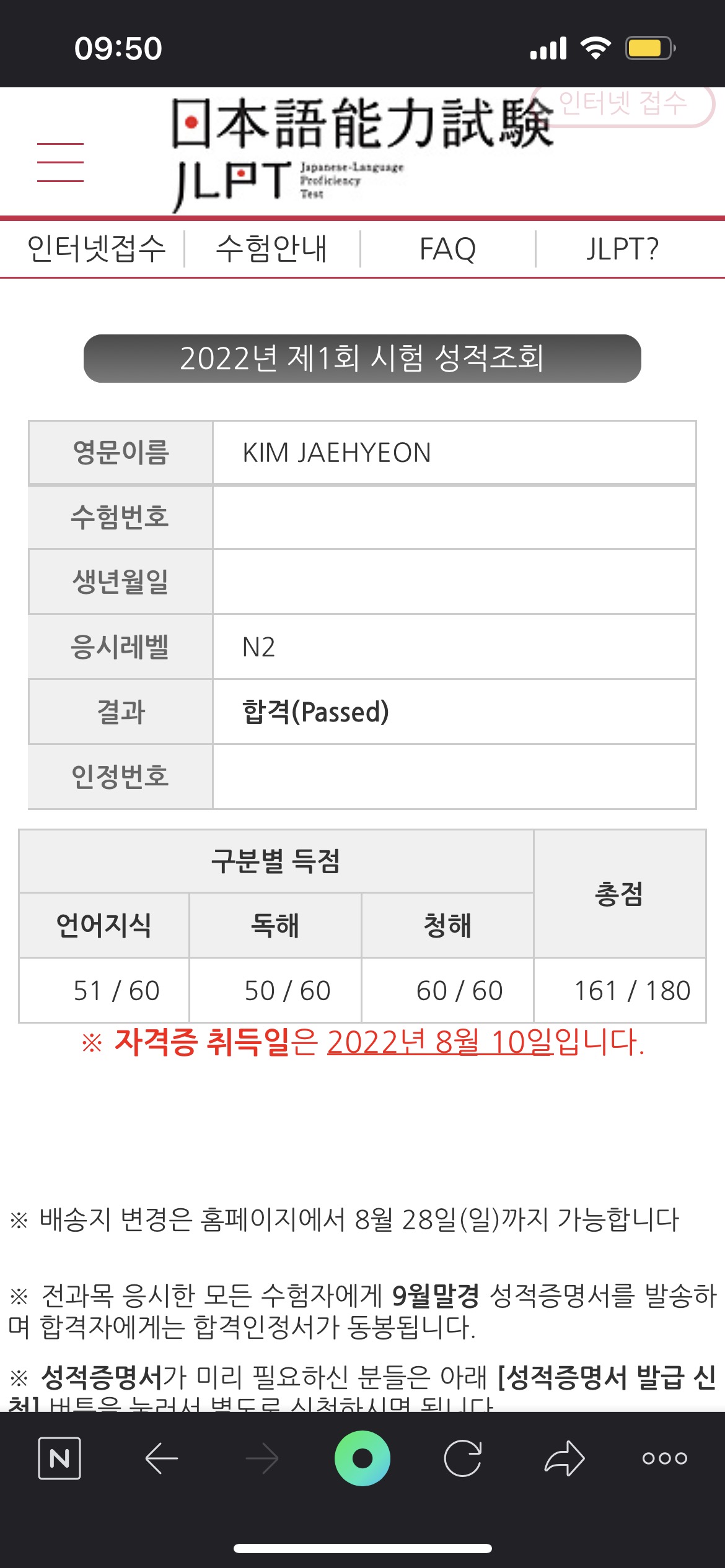5월부터 6월까지 두 달간 수빈쌤 강의를 들었습니다. 처음 본 jlpt시험인데 N2 161점 땄습니다!