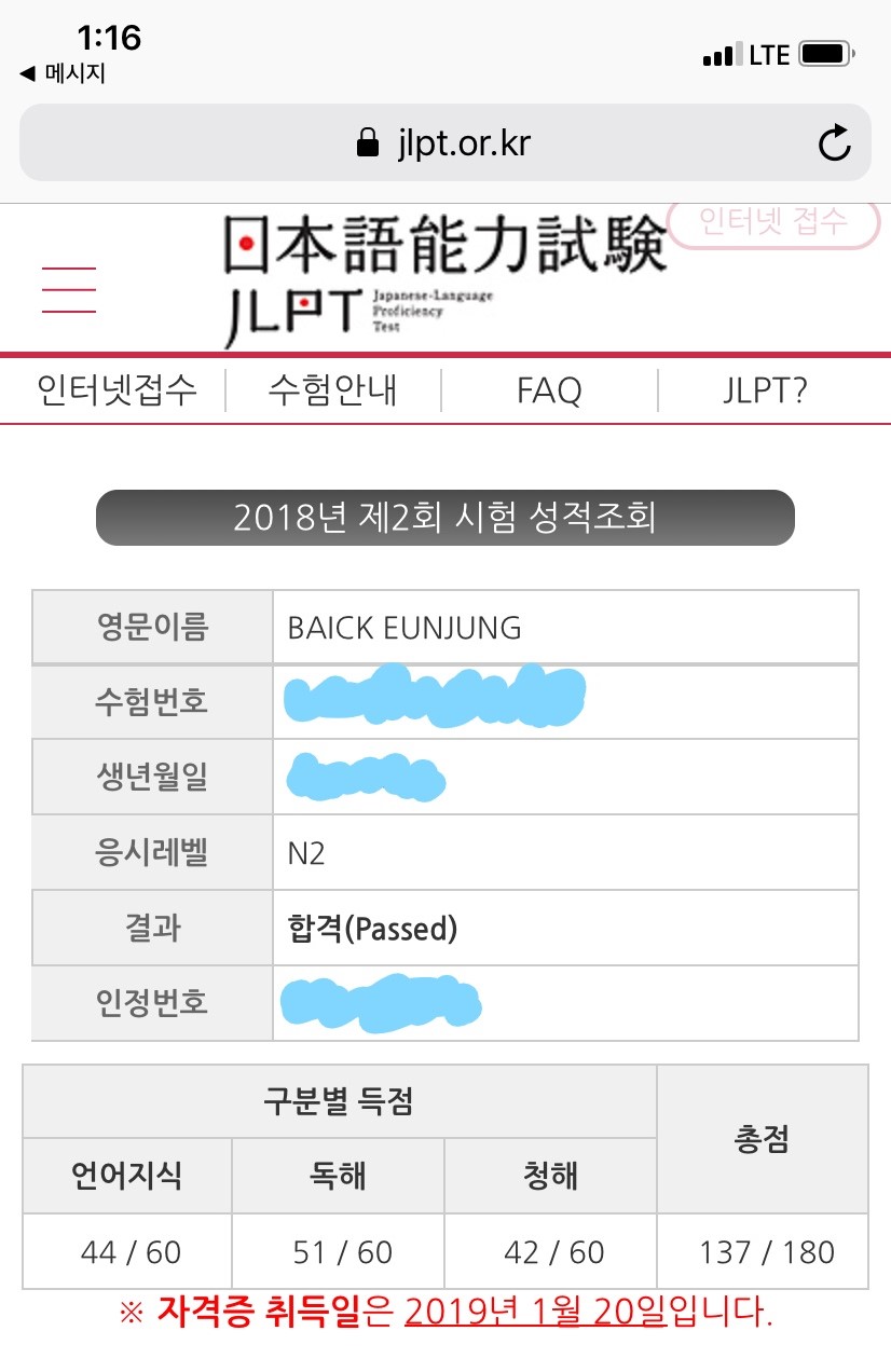 JLPT N2합격을 위해 2018년 7월부터 11월, 입문부터 문제풀이까지 5개월 동안 김숙경 선생님과 달렸습니다. 기초가 끝나자마자 N2 수업을 시작해서 한자도, 문법도, 심지어 JLPT시험이 어떻게 이루어지는지도 몰랐던 제가 합격할 수 있었던 것은 중요단어, 문법은 물론 시험에 필요한 스킬 등 마지막의 마지막까지 꼼꼼하게 챙겨주신 김숙경 선생님 덕분입니다. 선생님의 수업과 숙제를 성실히 하고 스스로를 믿고 끝까지 하고자 하는 의지만 있다면 분명 누구라도 합격할 수 있을 거라고 생각합니다. 선생님, 정말 감사합니다!