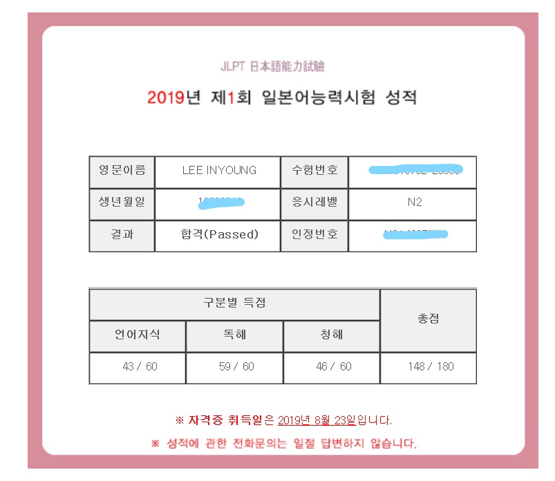 학기중이라 수업과 복습이외에는 jlpt 공부를 거의 하지 못해서 선생님 수업으로만 합격했다는 말이 과언이 아닙니다 ㅎㅎ 또 매번 시험 날짜, 상태를 신경써주셔서 감사했습니다. 기회가 된다면 꼭 다시 수업 듣고 싶습니다.