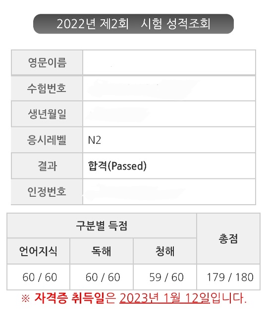 그리고 9월부터 우선희 선생님의 N2반 수업을 들으면서 본격적인 시험 준비를 시작했습니다. 언어지식 3개월, 독해&청해 2개월 수강했고 12월 시험을 봐서 180점 만점에 179점으로 합격했습니다. 일본어 공부를 시작한 지 1년도 채 되지 않았고, JLPT 수험 경험도 전무하고, 대학 졸업 후 시험을 위한 공부라는 걸 손에서 놓은 지도 한참이 되어가지만 이런 조건임에도 불구하고 3개월 만에 만점에 가까운 점수로 합격할 수 있었던 것은 우선희 선생님의 수업 덕분이라고 생각합니다.