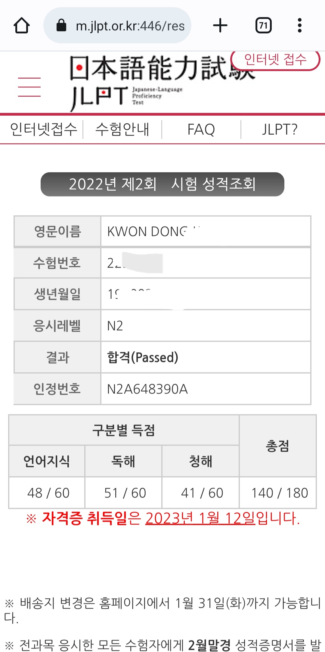 2회 정도 혼자 공부해서 N2응시 했었는데 불합격한 적이 있습니다. 낙담했고 오랫동안 손을 놓고 있다 시간이 지나 우연한 계기로 학원을 등록해 본 수업을 듣고 이번에 합격하게 되었습니다.