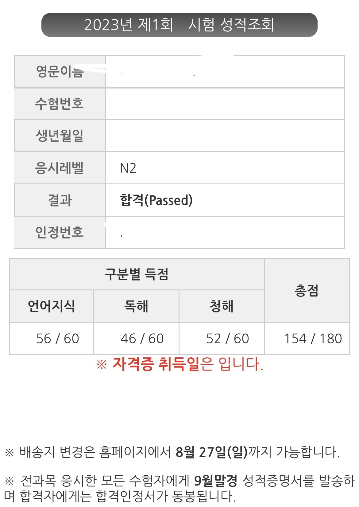 우선희 선생님의 N2 수업듣고 약 3개월만에 고득점 합격