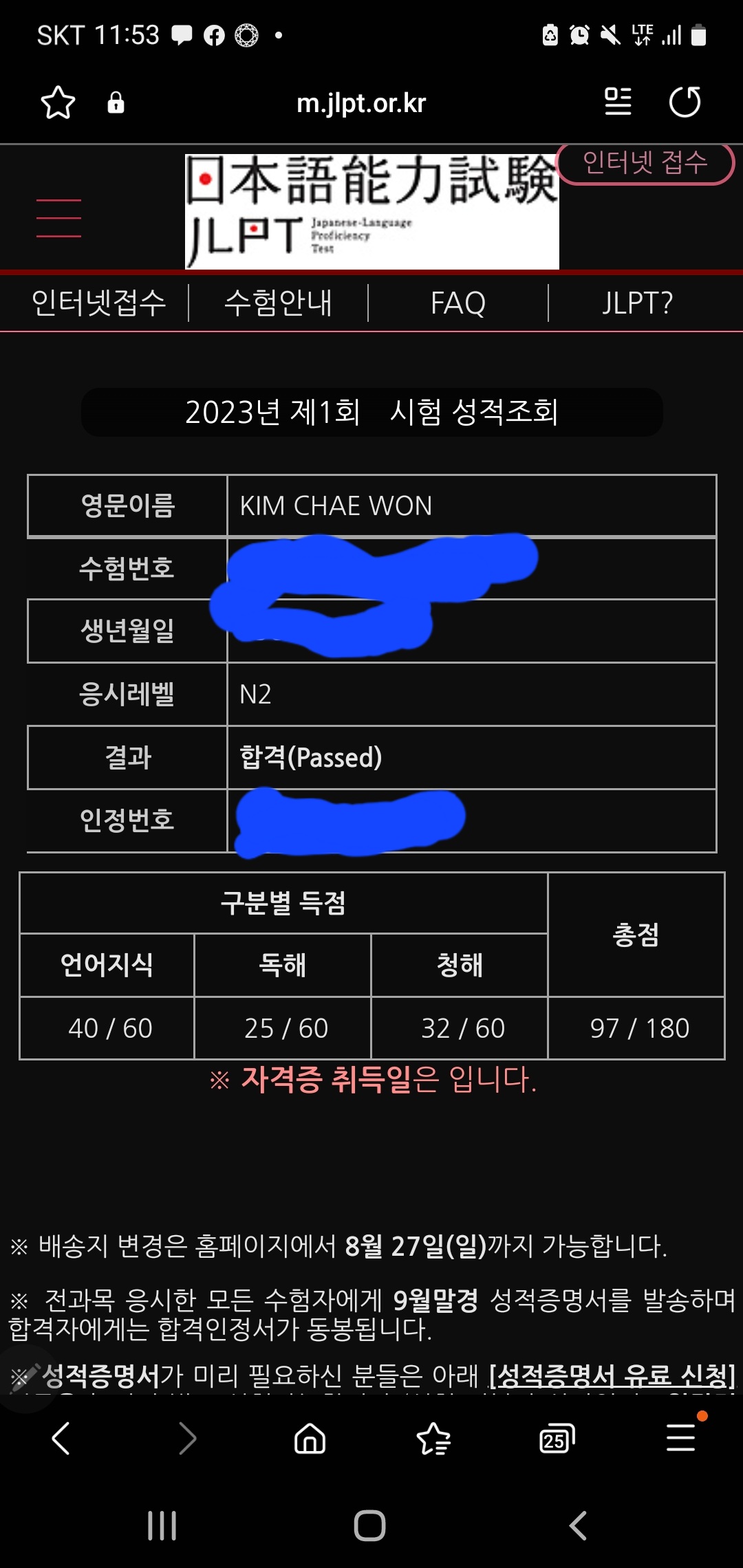 그래서 총점은 97점입니다. 저에게 관심을 많이 보이셨던 김숙경 선생님의 기대에 아주 못 미치는 성적을 거뒀지만,
