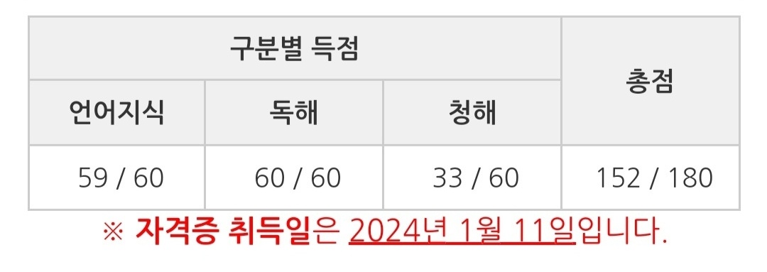 회사를 다니며 학원을 병행하다보니 수업외에 따로 뭔가를 공부할 시간이 없었어요. 그러다보니 자연스레 수빈샘 커리큘럼만을 예습복습 했고 결과는 59/60/33 입니다. 여러분 흔들리지 마세요. 그저 수빈샘만 믿고 가세요. 부끄럽지만 솔직발언하자면 저도 불안해서 마지막달에 모의고사집 샀었어요. 1회도 못풀었지만요. 호호호호호 그리고 청해는 다른 분 후기 들으세요. 그냥 제가 못한 거에요. 전략적으로 포기했었습니다. 직장 다니며 세 마리 토끼를 다 잡을 순 없었어요. 줄 건 과감하게 줘야 돼요. 아시죠? 공감해줄 건 공감해줘요. N1수업 전에 이미 알던 게 많았던 거 아니냐? 라고 물으실 수 있는데요. 굳이 정확하게 말하면 시사의 커리큘럼을 따랐습니다. 잇뽀잇뽀 히라가나부터 공부해서, 직전 7월 시험에 N2를 합격했고요. 그리고 이어서 수빈샘의 N1 수업 4달 듣고 시험을 치렀습니다. 1년 하고 4개월 정도 기간이 걸렸네요. 덧붙이자면 N2도 운좋게 수빈샘한테 배우긴 했었어요.