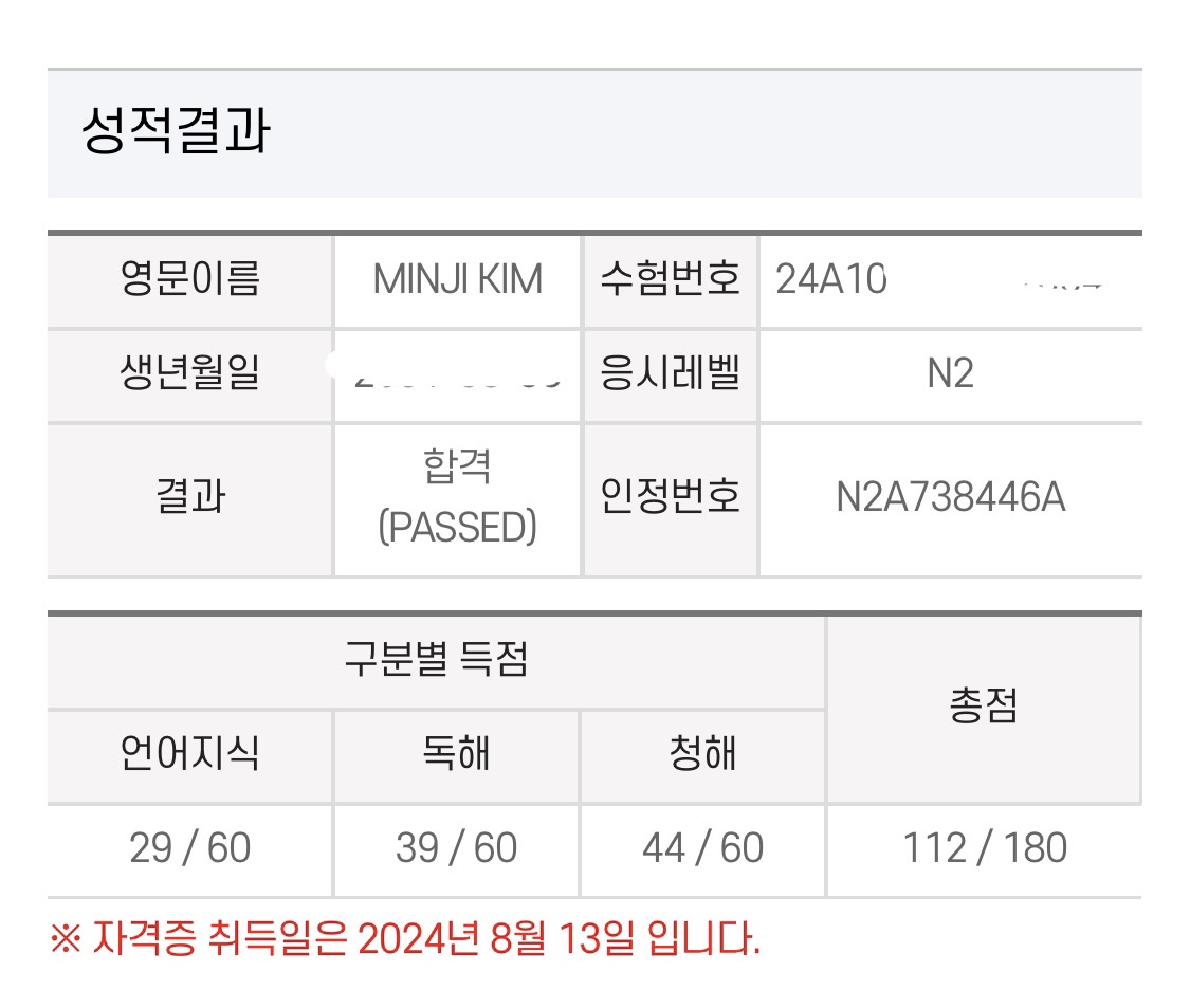 학교 졸업작품 준비와 N2 준비를 병행해서 합격할 수 있을까 걱정 많았는데, 숙경쌤 덕분에 즐겁게 공부했어요. 그 전까지는 고등학교 때 배웠던걸 베이스로 혼자 공부했었는데 선생님 수업 들으며 중요한 단어와 문법 위주로 반복해서 공부하니 시험보며 익숙한 부분이 많았아요. 숙제로 꾸준히 조금씩 문제를 푸니 JLPT 문제 유형도 자연스럽게 익숙해졌고 푸는 순서나 시간 배분에 있어서도 팁을 많이 알려주셔서 좋았어요. 일주일에 한 번, 4-5시간씩 수업 듣는게 쉽진 않았지만 정말로 좋아서 하는 공부였고 배우는 즐거움을 느껴서 학원가는 토요일이 기다려지곤 했어요. 매주 내주시는 숙제와 단어 암기만은 제대로 해가자는 마음가짐으로 수업 들었고, 선생님의 쏙쏙 들어오는 설명 덕분에 합격했다고 생각합니다. 앞으로도 일본어 공부 꾸준히 해서 워홀까지 가고싶어요- 감사합니다 ! |