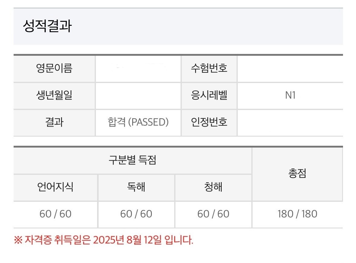 N1 만점 받았습니다!!!!