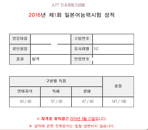 N2에 대한 자신감이 조금씩 생겨났고 2016년 1회 N2시험에 응시(최초응시)하여 합격하였습니다.