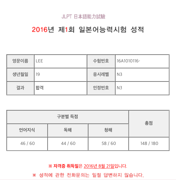 세컨드 스텝이랑 jlpt 대비반 듣고 합격했습니다. 기초문법만 배우고 바로 들어와서 수업따라가기도 힘들어했었는데, 합격했습니다:-) 선생님 말씀대로 드라마를 더 꾸준히 봤는데, 청해점수도 생각보다 잘나와서 기분이 좋네요. 점수가 많이 높지는 않아서 아쉽지만, n2는 좋은 점수로 합격하고 싶네요. 김태헌 선생님 감사했습니다~