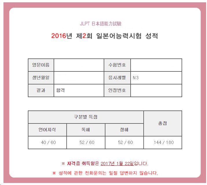 일본어에 대해서 대충은 감은 잡았지만 정작 아는 것은 없는 어중간한 실력이었기에, 시험을 2개월 남기고 뒤늦게 김태헌 선생님의 수업에 참여하였습니다 시간이 얼마 남지 않아 불안했지만 선생님을 믿고 수업을 거의 빠지지 않고 열심히 수강한 끝에 이렇게 합격후기까지 남길 수 있게 되었네요! 첫 한 달은 문법, 어휘, 독해, 청해를 통틀어 진행하면서 기본기를 익혔고, 남은 한달은 모의고사를 풀면서 실전 감각을 익힐 수 있었습니다 수업중 학생의 참여를 유도하고 질문도 자주 하셔서 공부도 절로 되는게 무척 맘에 들었어요 수업 외에 다른 교재로 공부하지 않았어요! 수업내용만으로도 공부할게 산더미여서.. 더 길게 수강했더라면 지금보다 더 높은 점수였을텐데 아쉬워요 ㅠㅠ 정말 자신 없었는데 이렇게 합격하다니 정말 다행이에요! 앞으로 N2, N1까지 쭉쭉 합격하고 싶습니다!~