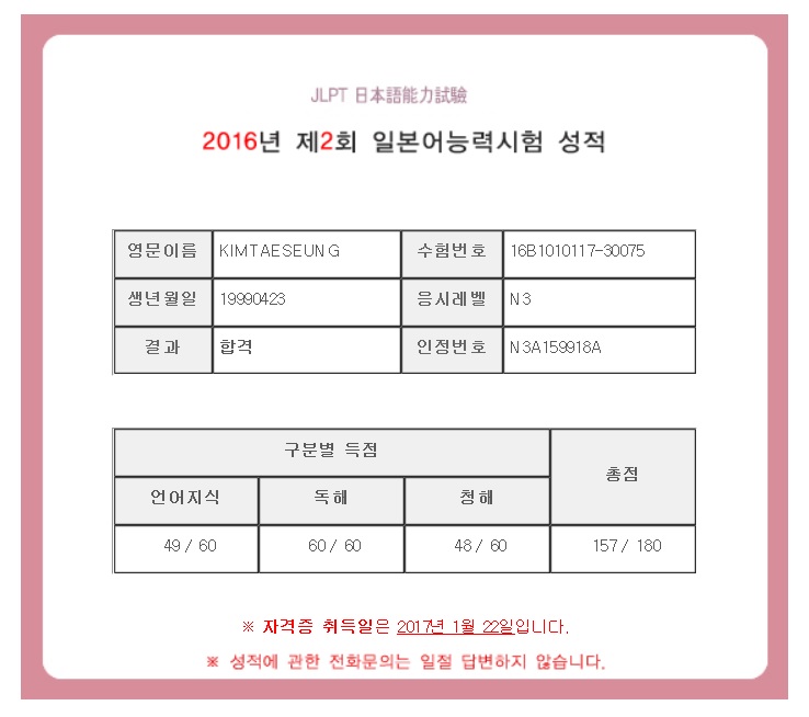 9월부터 경정윤 선생님 수업 듣기 시작해서 12월에 시험을 쳤는데 결과는 합격!! 매일매일 단어체크/문법체크를 통해서 이런 결과가 나온 것 같습니다. 선생님 부교재에 나와있는 설명 너무 자세히 나와있어서 집에서 혼자 공부할때도 이해하기 쉬웠고 질문이 있을때 선생님께 질문을 하면 바로바로 질문에 대한 대답을 해주셔서 더욱 이해하기 쉬웠습니다. JLPT N3대비는 경정윤 선생님!! |