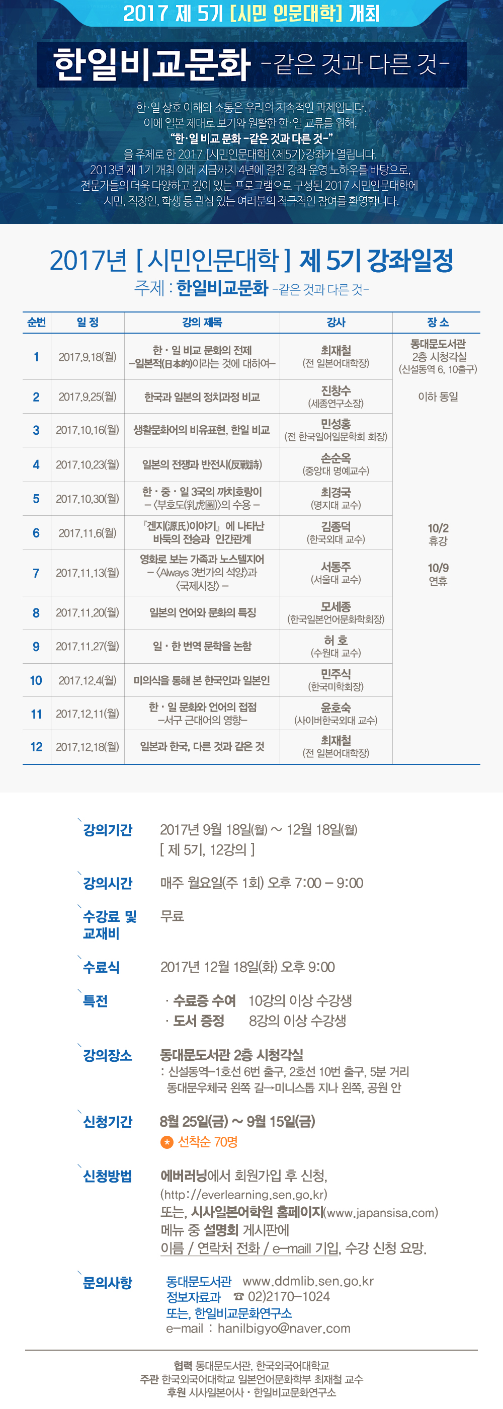 2017 제 5기 [시민인문대학] 개최 - 한일비교문화 '같은 것과 다른 것'