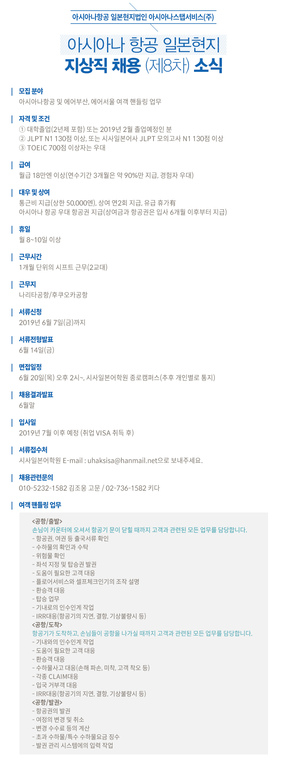 아시아나 항공 일본현지 지상직 채용(제8차) 소식
