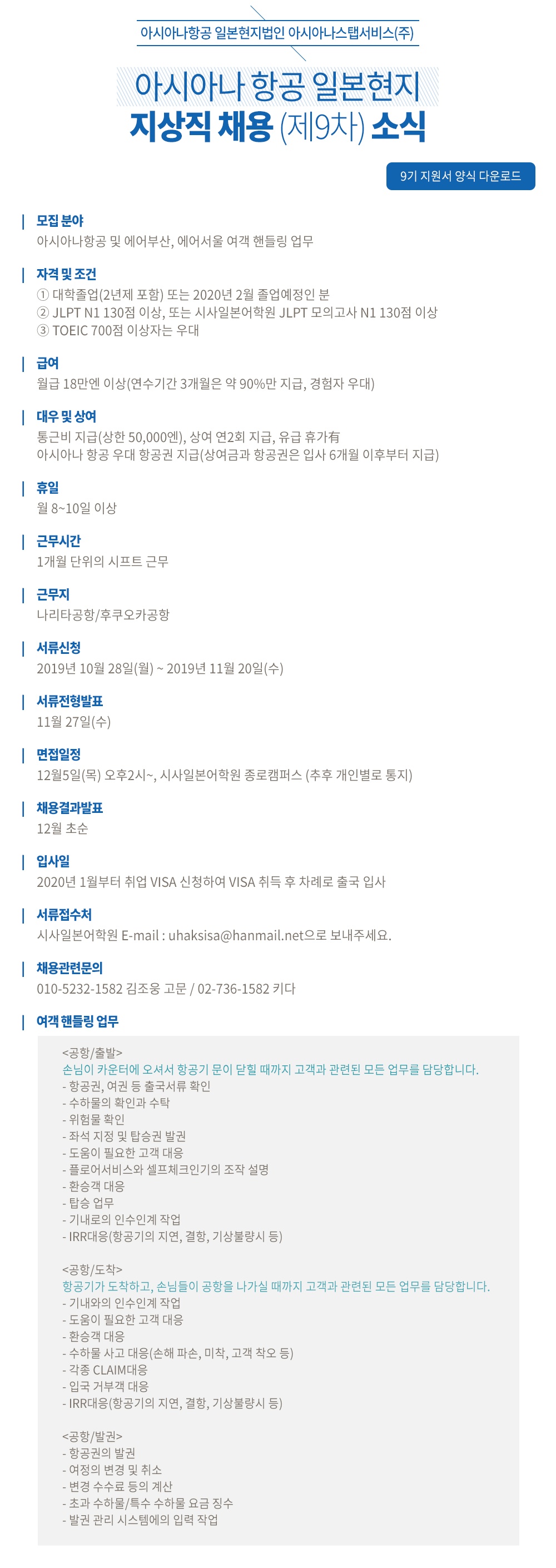 아시아나 항공 일본현지 지상직 채용(제9차) 소식
