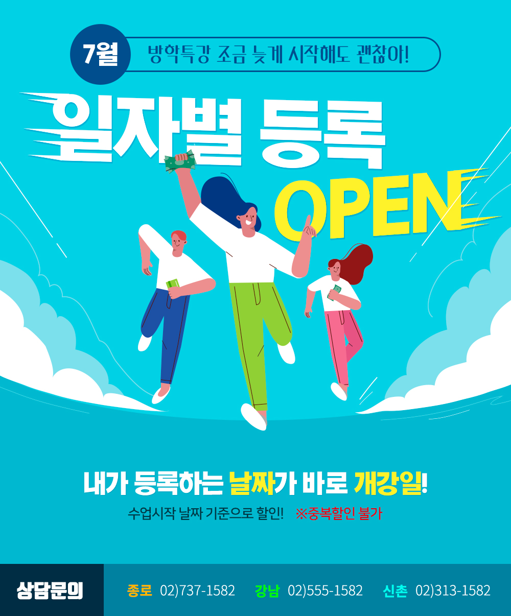 방학특강 조금 늦게 시작해도 괜찮아! 7월 일자별 등록!