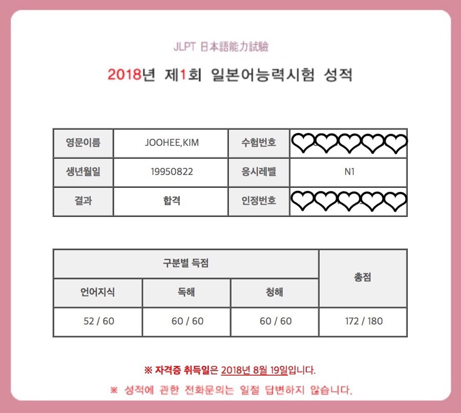 언어지식 52점, 청해 독해는 만점으로 172점 받아서 합격했어요!! 교환학생 가기 전 N3수업도 승희쌤께 듣고 고득점으로 합격해서 망설임 없이 이번에도 승희쌤 수업 신청했습니다! 교환학생 끝나고 와서 토익, 한국사 등등 다른 자격증들이랑 같이 준비해서 공부시간이 제 기준 만족스럽지 못해서 점수 잘 못 받으면 어떡하지 엄청 걱정했었는데 생각보다 엄청 점수 잘 받았어요 ㅠ.ㅠ!! 선생님께서 N3때부터 바탕을 튼튼하게 잘 잡고 N1에서도 콕콕 찍어주신 덕분인 것 같습니다 >.<