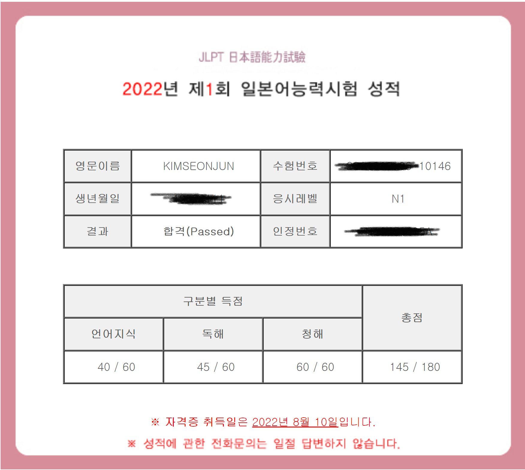 시험이 40일 정도 남았을 때부터 급하게 공부하다가 언어 지식은 단순히 단어 책을 보면서 공부를 할 수 있기에 문제없이 공부하는 도중 문득 청해와 독해 같은 경우는 어떻게 공부해야 하지? 라는 생각이 들어서 이번에 황지영 강사님 강의를 듣게 되었습니다. 그리고 한 달 동안 수업을 들으면서 굉장히 실력이 많이 늘었고 그 결과 짧은 기간 준비해서 한 번 만에 jlpt n1 시험에 합격할 수 있었습니다! 수업을 통해서 배울 수 있었던 것은 독해 같은 경우는 문제를 빠르고 정확하게 풀 수 있는 방법과 틀렸을 경우 오답 노트 하는 방법을 배울 수 있었고, 청해 같은 경우는 선생님이 청해 문제를 풀고 나서 대사를 직접 문서화해서 철저하게 오답 노트를 하면서 빠르게 실력을 향상시킬 수 있었습니다. 정말 처음에 왔었을 때 독해 푸는 게 다 틀려서 붙을 수 있을까? 고민했었는데 한 달 만에 독해 실력이 일취월장해서 덕분에 바로 합격할 수 있었습니다 ㅎㅎ 저처럼 공부하다가 독해에 어려움을 겪고 있거나 청해가 잘 안 들리는 분들은 이 수업을 들으면 빠르게 실력을 향상시킬 수 있기 때문에 강력히 추천드려요!!