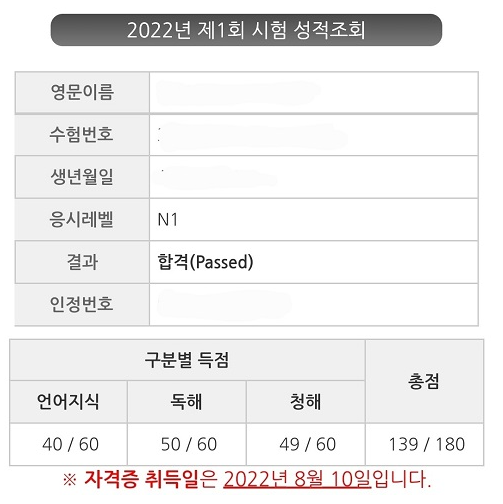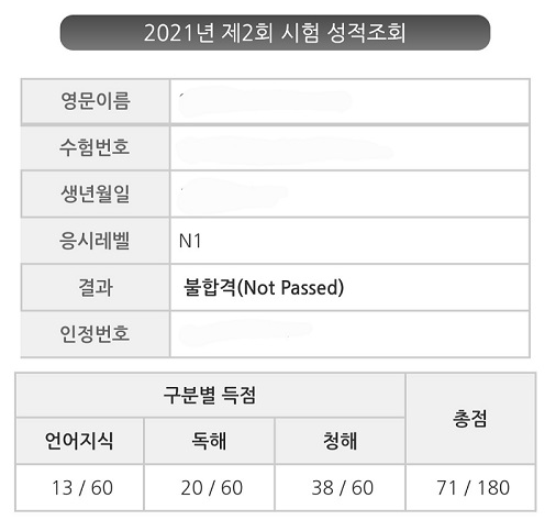 저는 2019년 7월에 N3를 턱걸이 합격하고, 이후 2021년 12월에 N1을 정말 모의고사로 보겠다는 가벼운 마음으로 시험 치른 것이 전부입니다. 당시 점수 :