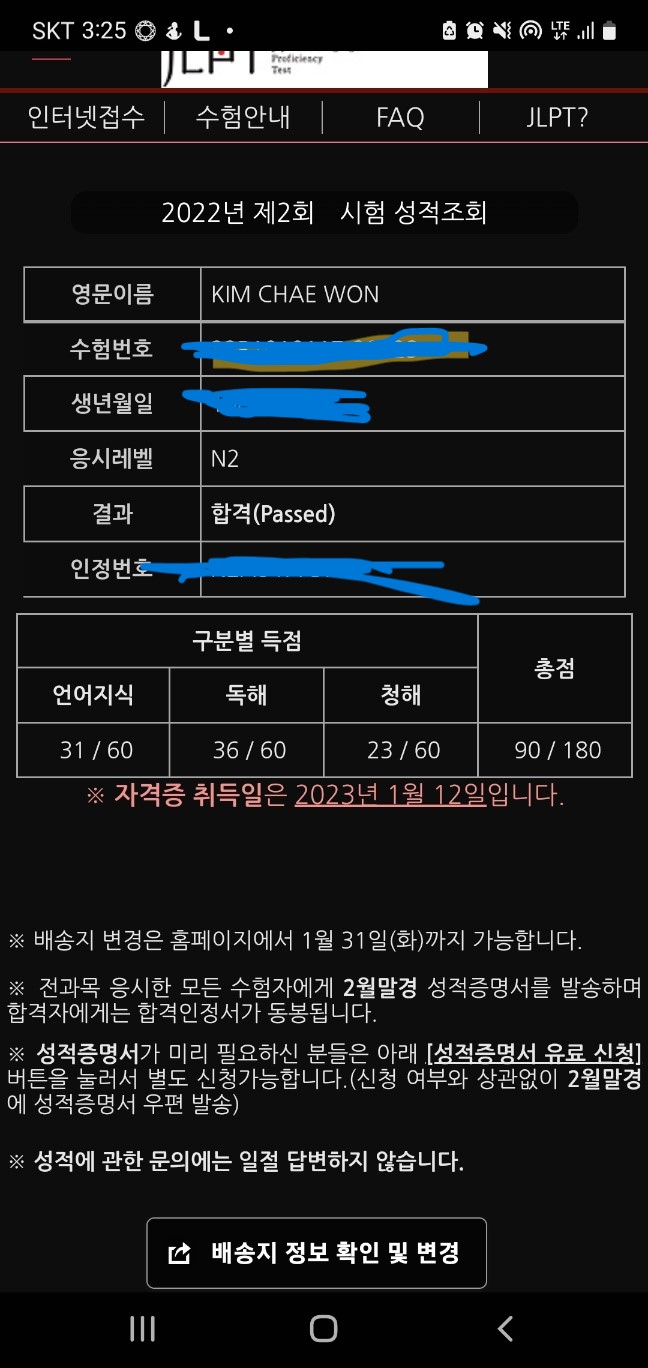 2022년 12월 JLPT 시험 합격했습니다.