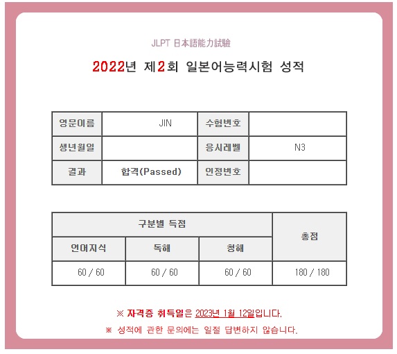 작년 2월달부터 일본어 공부를 시작해서 올해 12월 N3 시험까지 걱정과 염려가 많았지만, 희숙 선생님 수업이 정말 재미있어서 공부에 있어 하나도 힘든 일 없이 술술 익힐 수 있었어요. 즐거운 수업과 더불어 수업 분위기도 정말 좋아서, 수업 때 만나게 된 사람들과의 추억도 정말 잊지 못할 것 같아요. JLPT 자격증 취득을 위해 공부하시거나 학원 고민하는 분이 계시다면 N3는 정말 국내외를 막론하고 희숙샘같은 선생님이 없어요! |