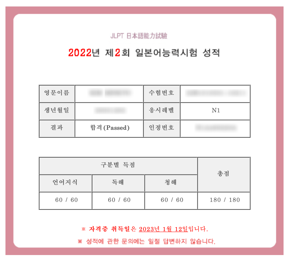 N1 만점 받았습니다. 감사합니다.
