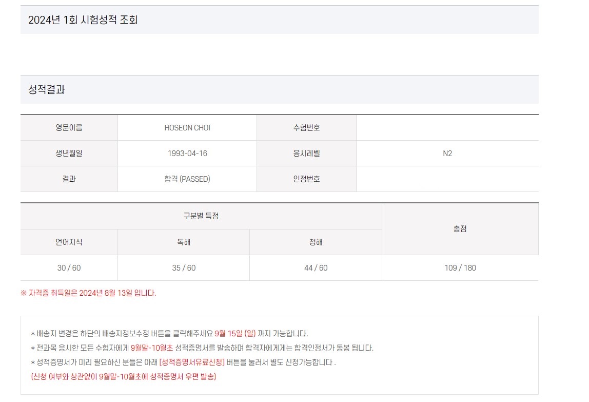 2022년 12월 일본어 히라가나부터 시작해, 2024년 7월 드디어 JLPT N2를 획득하였습니다.