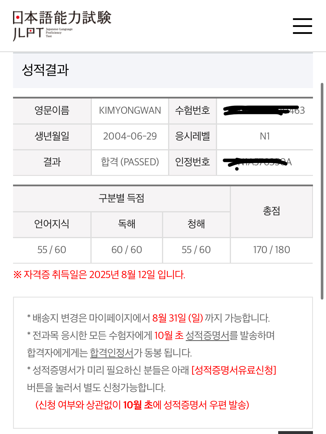 2025년 2월부터 수업을 들어 온 학생입니다. 평소에 애니메이션을 보거나 음악을 들으면서 어느 정도 단어는 알고 있는 편 이었지만 한자와 문법이 약해 걱정이 많았습니다. 하지만 경유정 선생님 수업을 듣다 보니 어느새 JLPT N1을 170점으로 합격하게 되었습니다. 여러 번 반복해서 집어 주시면서 한자와 단어를 자연스럽게 외울 수 있게 해주셨고, 독해는 스스로 해석해 보고 선생님의 해석과 비교하다 보니 자연스럽게 실력이 올라갔습니다. 청해도 반복해서 하다 보니 점수가 올랐습니다. 진짜 단기간에 N1을 따고 싶다 하시면 경유정 선생님 강의 만큼 좋은 게 없을 것 같아요 너무 좋았습니다.