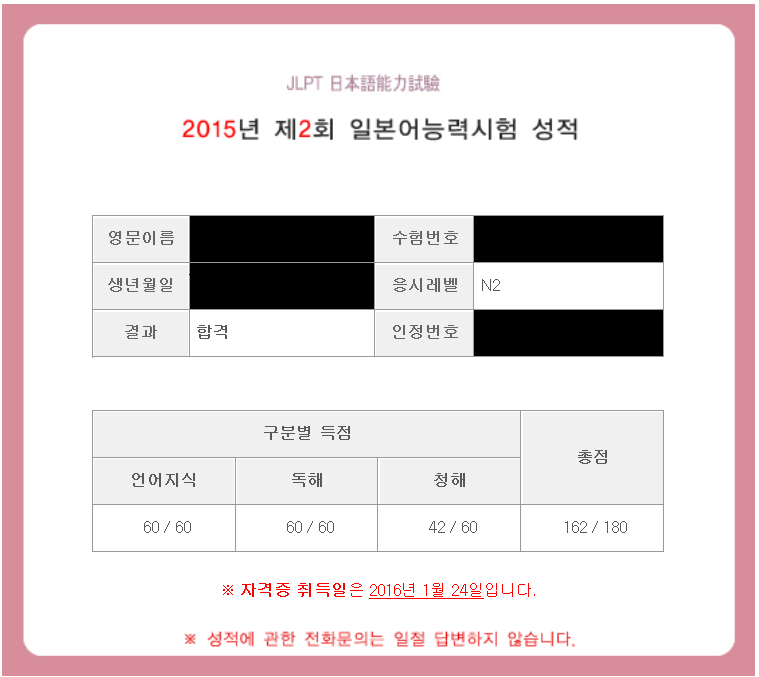 저는 2015년 7월부터 일본어를 시작하여 12월 초 JLPT N2에 응시하여 총 5개월만에 자격증을 취득하게 되었습니다.