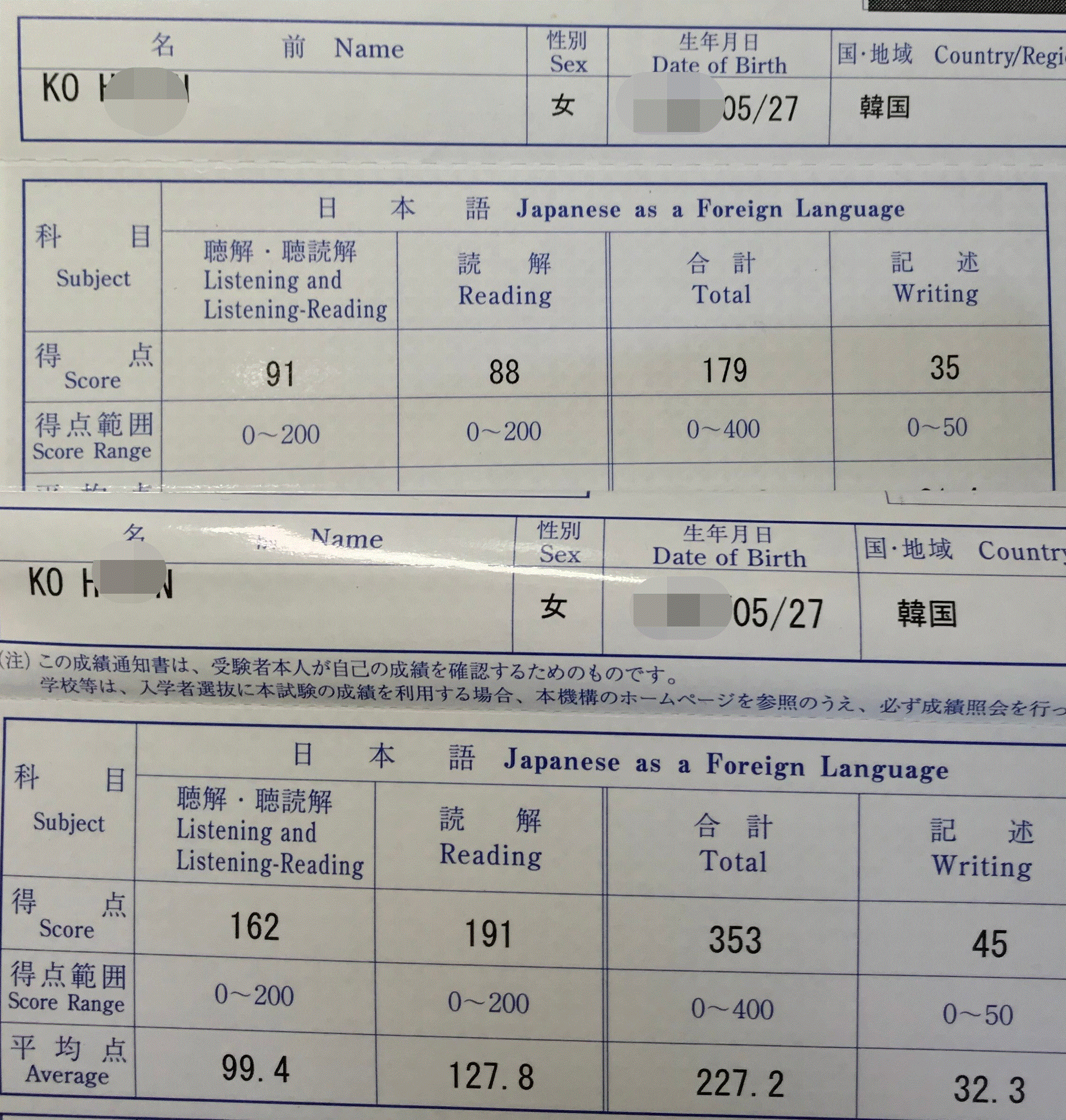 일본어 수업은 40분정도 한자프린트를 보고 유인물에 나와있는 한자에 관련된 속담이나 숙어, 관련 한자를 정리해 주십니다. 한자는 지망이유서나 독해 문제를 풀 때 도움이 많이 되니 수업후에는 꼭 메모한것들을 노트에 다시 정리하면서 나의 것으로 만드는게 중요합니다! 독해 문제를 푼 뒤 청해, 청독해 순서로 수업이 진행이 됩니다. 청독해와 청해는 집중력 있게 푸는 연습을 하는 것이 중요합니다. 특히 청해의 경우 ‘남학생과 여학생이 대화를 하고 있습니다. 여기서 남학생이 선택할 강의로 올바른 것은?’이라는 문제가 나오면 W(woman), M(man)에서 M에 동그라미를 치고 난 후, 남학생이 하고 싶은말을 집중적으로 들으면서 문제를 풀다보면, 사소한 실수를 막을 수 있었던 것 같습니다. 일본어 과목은 단번에 점수가 오르는 과목이 아니니 무엇보다 꾸준함이 가장 중요한 과목이라고 생각합니다. 그리고 저는 일본어로 무언가를 듣는 양을 늘리고 싶다는 생각에, 식사 할 때나 수업 십분 전, 자기 전, 공부가 안되는 날에는 NHK의 ドキュメンタリー72時間이라는 우리나라의 KBS에서 방영하고 있는 다큐3일과 비슷한 다큐멘터리를 자막없이 보면서 모르는 표현이나 좋은 표현을 메모해 적어두곤 했습니다. 그게 실제로도 EJU문제를 풀 때 많이 도움이 되었습니다. 가끔 주종관 선생님과 입시상담을 하러오는 친구들 중에 한국에서 입시를 준비하는게 좋은지 일본에 가서 일본어학교를 다니면서 입시준비를 하는게 좋은지 상담하러 오는 친구들이 있다고 들었습니다. 금전적 여유가 있고, 대학입시 스트레스를 못 견딜 것 같은 친구들은 일본에 가서 입시준비를 하는 것이 좋지만, 질좋은 문제들을 많이 푸는 데에 한계가 있을 것 이고, 일본에는 한국인 대상으로 전문적으로 EJU를 가르치는 학원이 없기 때문에(중국인을 대상으로하는 EJU학원은 정말 많습니다!!) 한국에서 준비하는 편이 좋다고 생각합니다. 작년에 한국에 돌아와 EJU공부를 하면서 하루에도 몇 번씩 인생에서 좌우될 중차대한 일에 대해서 내가 함부로 넘겨 짚어버린 것이 아닌가 매일 후회하고 힘들어 했었습니다. 그럴 때 선생님이 한달에 한번씩 모의고사가 끝난 다음날 해주신 조언과 관심이 많이 힘이 되었던 것 같습니다. 교사로서의 역량 뿐만아니라 학생과 소통하며 수업 이상의 가르침을 주시는 진솔함을 가진 선생님 덕분에 포기하지 않고 입시라는 레이스를 무사히 완주할 수 있었던 것 같습니다. 제가 작년 이맘때쯤 한자시간에 倦まず弛まず라는 표현을 알려주셨는데, 이 문장의 뜻은 싫증내거나 게으름 피우지 않고, 꾸준히. 라는 표현입니다. 입시를 준비하는 학생으로서 꾸준하게 성실히 공부를 해 나간다면 모두 좋은결과 얻을 수 있을 것이라고 믿습니다! 중구난방으로 쓴 글이 도움이 되었으면 좋겠네요. 모두 좋은 결과 있기를 바라겠습니다!! 화이팅! 주종관 선생님 정말 감사드립니다. 포기하려고 할 때마다 따끔하게 한마디씩 해 주시고 제가 모르는 부분에 대해서 선생님의 개인시간까지 내, 알려주셔서 정말 감사합니다. 선생님의 가르침 절대 잊지 않겠습니다! 아래성적표는 EJU수업을 듣기 전 EJU수업을 들은 후의 제 성적표입니다.