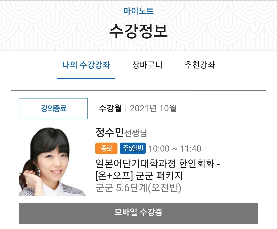 | 2719 | 종로 | JIP 한인회화 | 군군 패키지 - ·군군 5.6단계(오전반/패키지) | 정수민 |