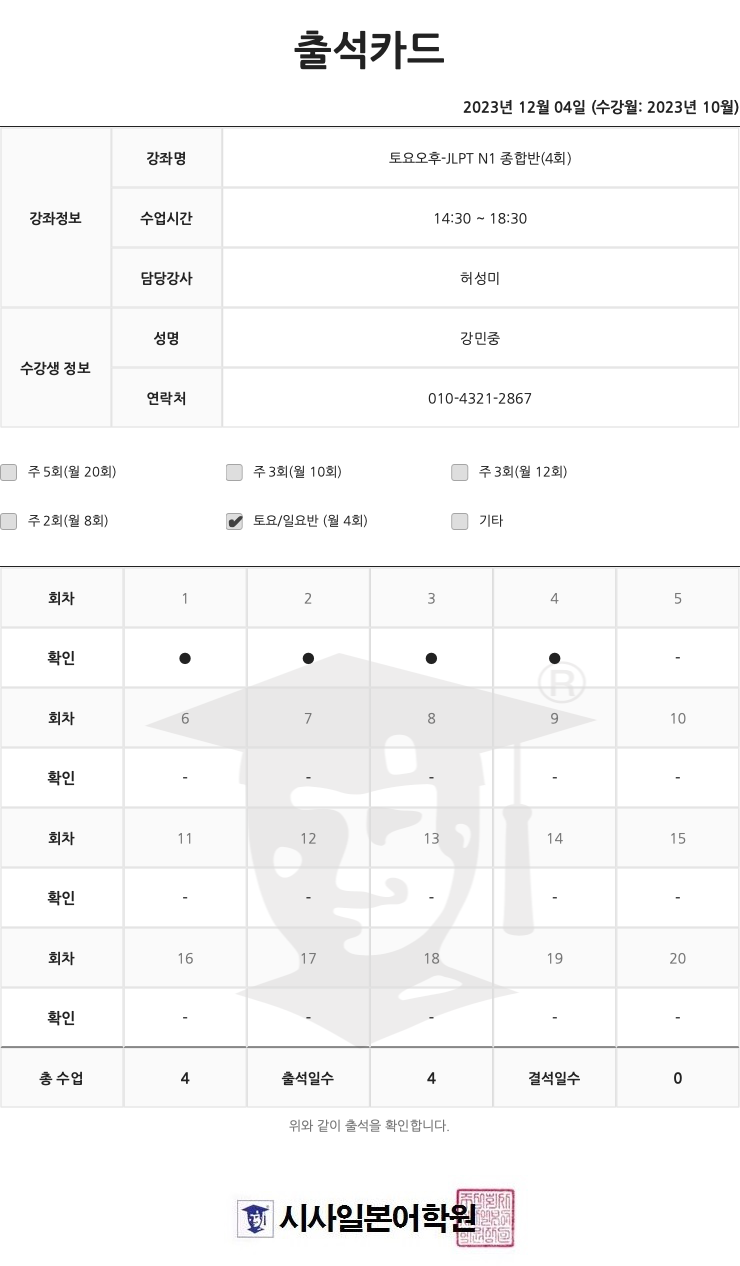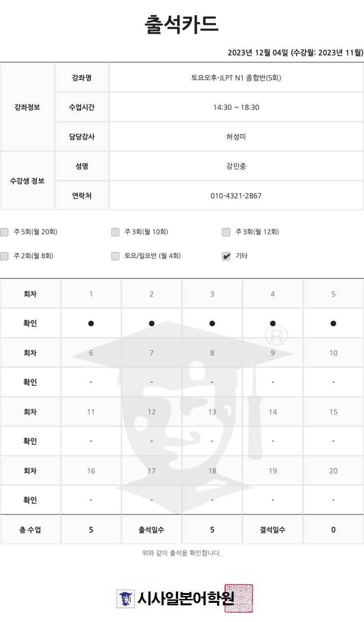 9월부터 12월 시험 전 수업, 그리고 특강까지 들었던 수강생입니다~ 대학교 수업을 금요일까지 듣고 매주 토요일 왕복 4시간 긴 이동시간에도 그만큼 유익한 수업이었습니다.