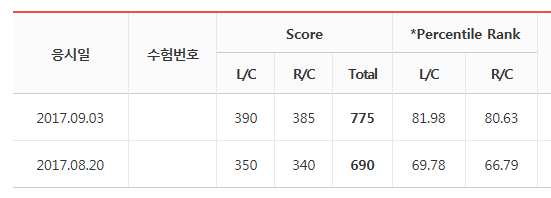 수빈 선생님과 8월 한 달 동안 600점 수업을 함께 하고, 8월 20일 690점, 9월 3일 775점을 받았습니다. 애초에 600점만 넘겼으면 좋겠다고 생각했던 터라 690점을 받았을 때도 믿어지지 않았는데, 이렇게 2주 만에 85점이나 점수가 더 오른 것을 보니 너무너무 선생님께 감사하고 기쁜 마음 뿐입니다ㅠㅠ