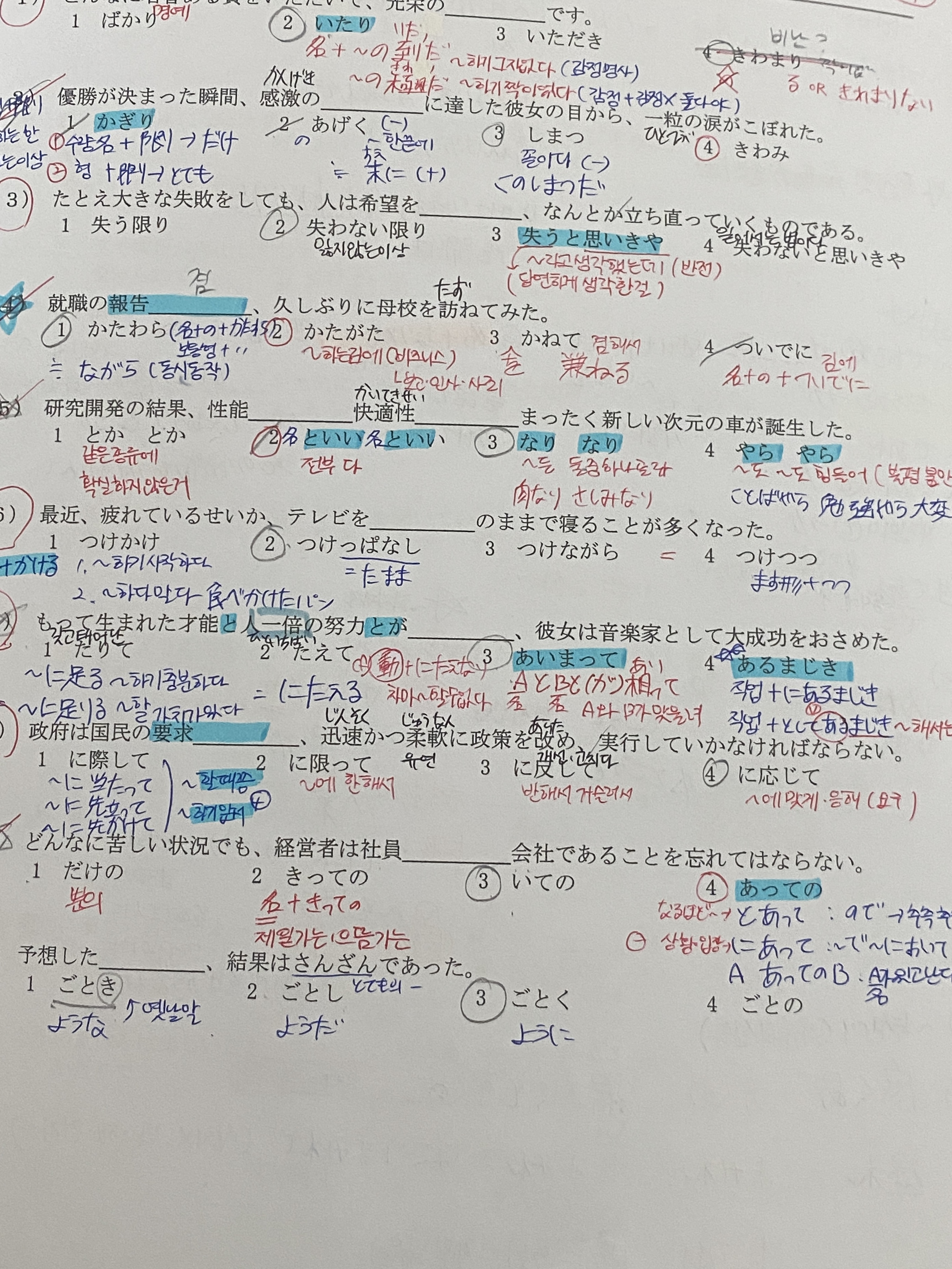 3. 다의어, 유의어, 기출 단어 정리 - 유의어의 경우도 N1 수준의 단어들로만 알려주시기에, 그룹화해서 암기하기 쉬웠습니다. 저는 문법이 약했기에, 문법은 물론 독해도 절반 틀릴 정도였습니다. 하지만 중간중간 짧은 예문을 들어주시고, 다른 회차 수업에서도 똑같은 예문으로 상기시켜주시기에 훨씬 이해하기가 용이했고 막판에는 틀린 개수도 많이 줄었습니다.