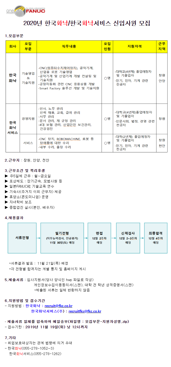 [정보 제공] 한국화낙 2020년 한국화낙(주)/한국화낙서비스(주) 신입사원 모집