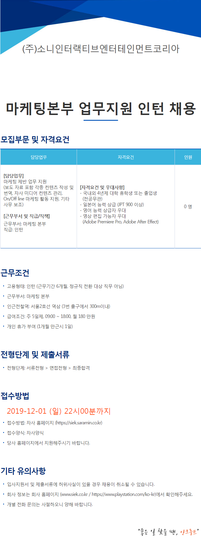 [외국어 우대] 소니인터랙티브엔터테인먼트코리아 마케팅본부 업무지원 인턴 채용