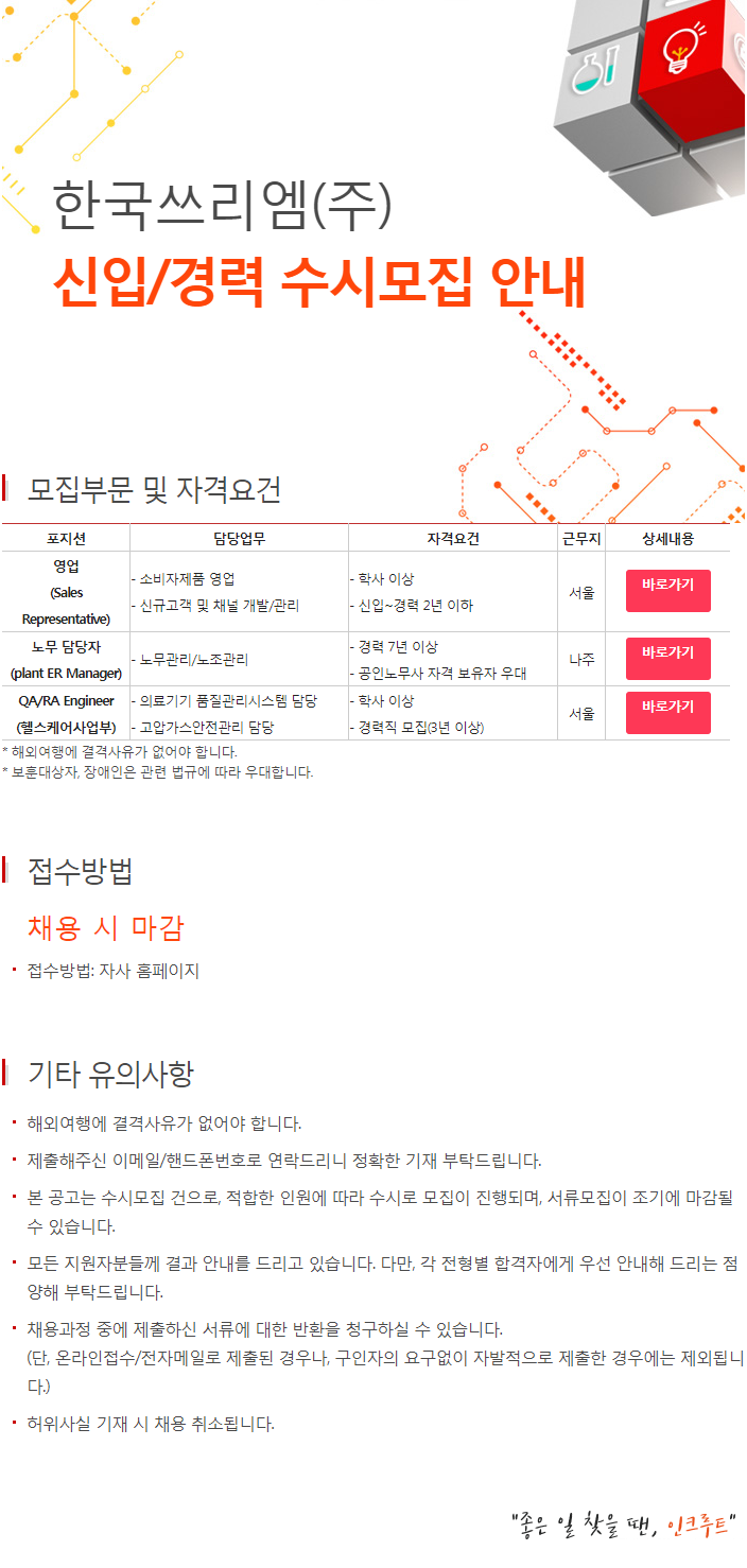 [채용 정보] 한국쓰리엠 신입/경력 수시모집 안내