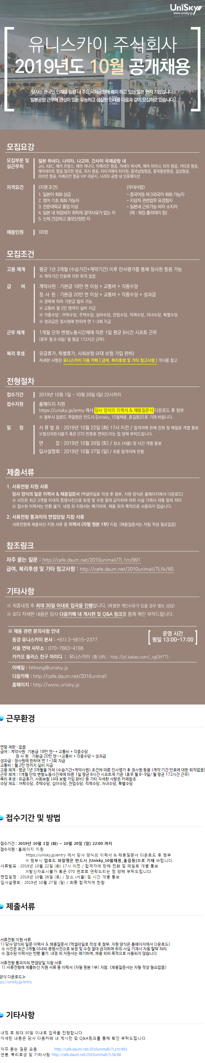 유니스카이 [일본취업] 유니스카이(주) 2019년 10월 공개 채용