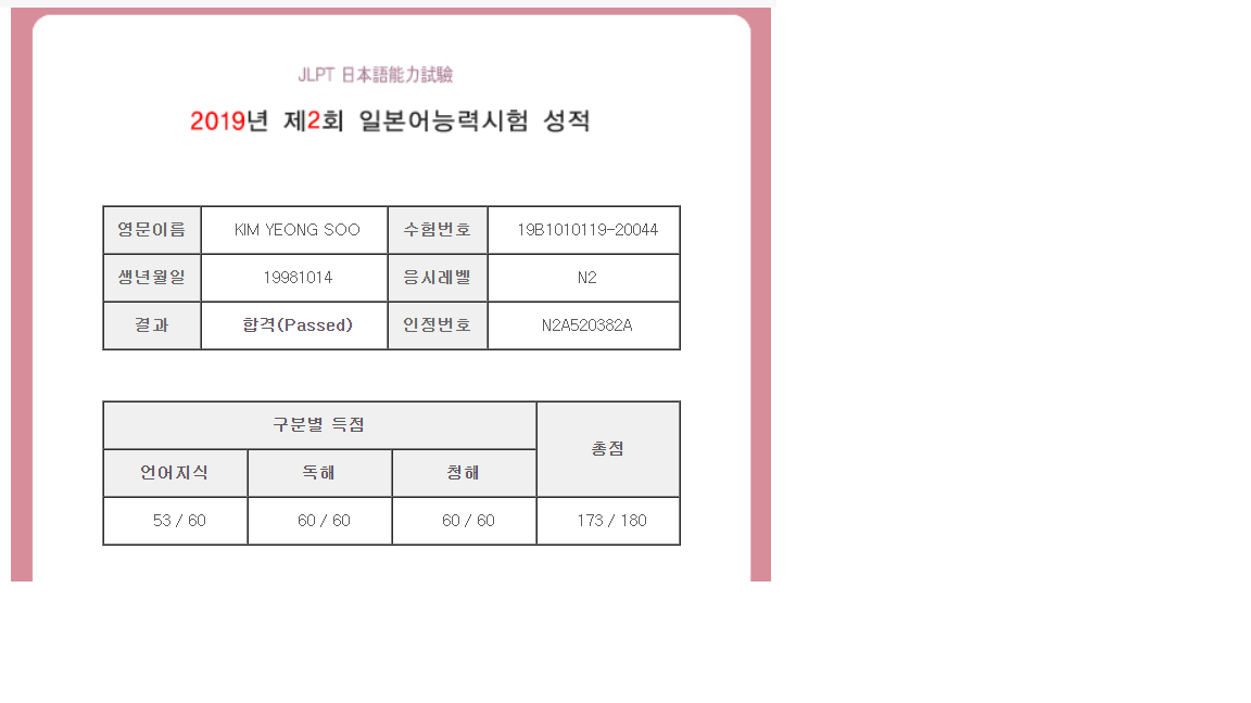 대학을 다니면서 학기 중인 9월부터 JLPT N2 공부를 시작했습니다. 기존에 일본어를 독학하고 있긴 했지만 시험을 목적으로 공부하는 것은 처음이었기에 어떻게 시작해야 될지 막막해서 학원을 등록했습니다. 학기 중에는 시간이 애매해서 주말반으로 등록을 했는데 시험을 위한 시간이 부족하다고 처음에는 생각했지만 김성준 강사님께서 자세히 알려주셔서 비록 긴 기간은 아니었지만 N2에 합격할 수 있었습니다. 주말반의 특성상 주간반 보다는 수업시간이 짧고 중간중간에 테스트도 없지만 아침 일찍부터 컨디션을 고려해주시면서 수준에 맞게 천천히 설명해주셔서 재밌게 들을 수 있었습니다.