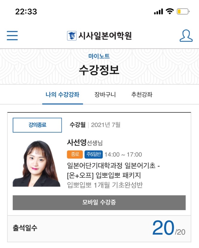 하루에 3시간씩 주5일 수업이라서 걱정했었는데 3시간이 정말 빠르게 느껴질만큼 항상 열정적으로 재밌게 수업해주셔서 감사했습니다 : ) 회화연습도 많이 할 수 있어서 좋았고, 문법도 이해하기 쉽게 잘 설명해주셨어요! 기회가 된다면 선생님 수업 또 듣고싶어요!!! 선생님 감사했습니다~! |