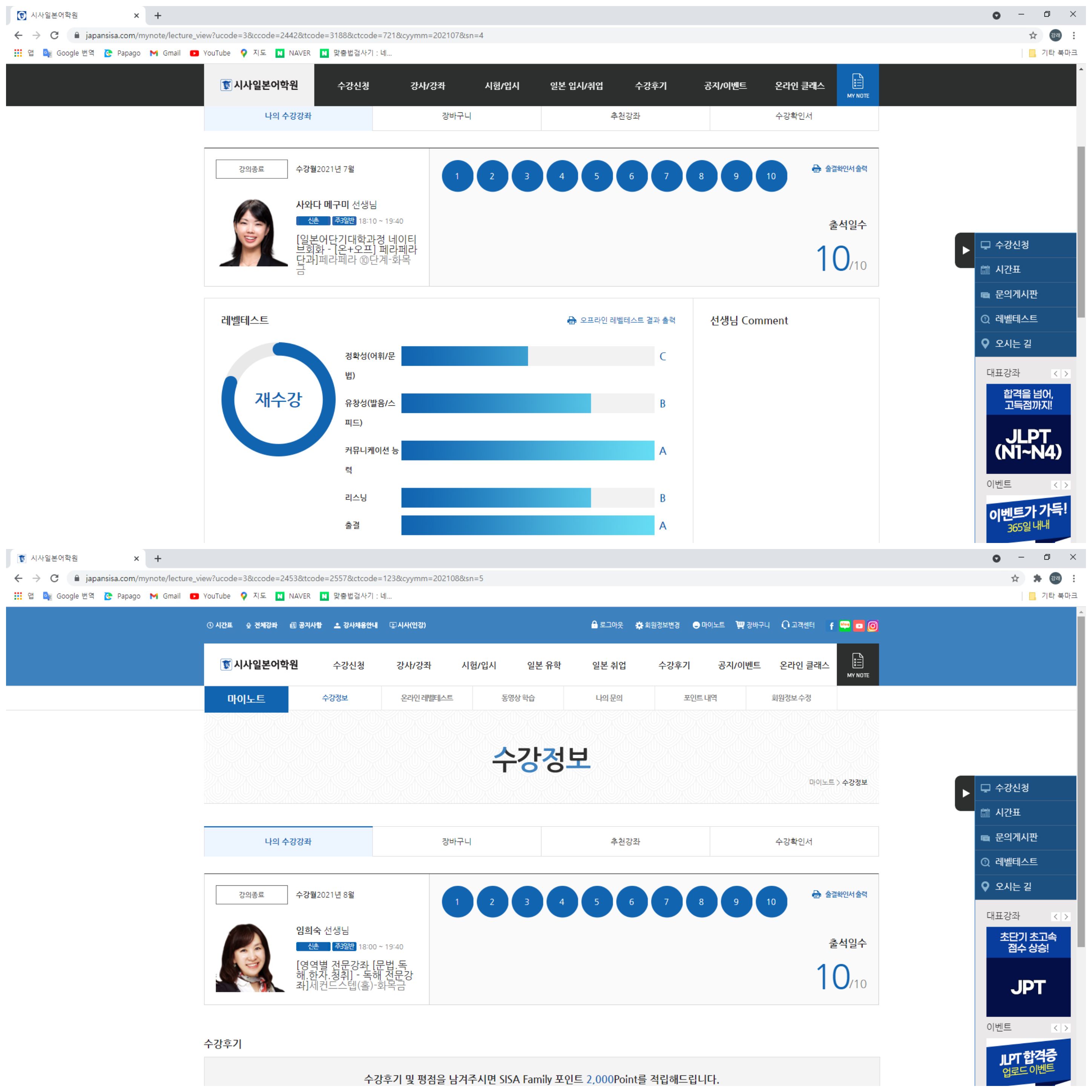 지금은 그 선택이 일본어를 학습하는 데 있어서 좋은 선택이었다고 생각합니다. 왜냐하면 독해를 함으로서 일본어 학습의 근간을 파악하는 데 도움이 되었기 때문입니다. 그리고 이를 발판 삼아 단순 자기개발로 시작한 일본어를 더욱 열심히 하겠다는 동기부여도 갖게 되었습니다. 그래서 9월부터는 N3 실전반도 등록하였습니다. 그래서 일본어 시험에도 매진하며 하루하루를 더 알차게 보내려고 합니다. 아울러 임희숙 선생님의 N3 실전반 수업도 많은 기대하겠습니다. 고맙습니다. |