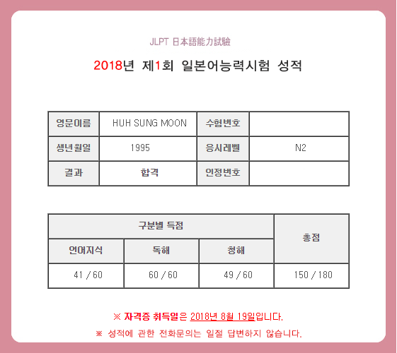 3월부터 N2 강의를 수강했는데 선생님께서 재밌고 쉽게 가르쳐주신 덕분에 즐겁게 공부할 수 있었어요 저는 학교 생활과 기타 다른 시험 준비를 병행하느라 일본어 공부에 시간을 온전히 투자하기는 어려운 상황이었어요 그래서 선생님 강의가 더 큰 도움이 되었던 것 같습니다 나눠주신 단어장의 내용만이라도 충실히 숙지하자는 마음으로 공부했더니 합격이라는 결과를 받아볼 수 있게 되었네요 혼자서 공부했다면 이렇게 단기간에 합격하지는 못 했을 것 같아요