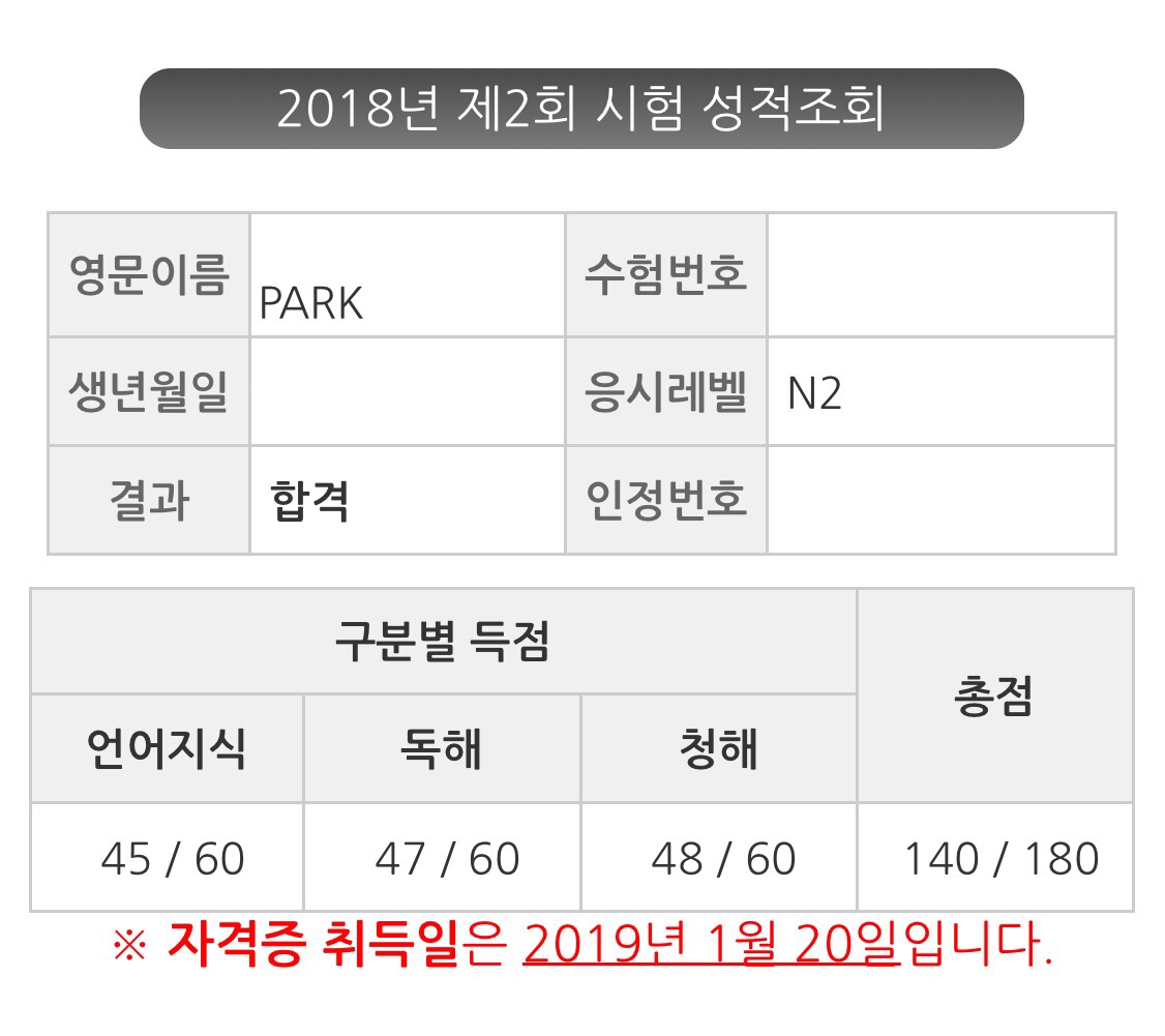 물론 그 전에 1년 반 정도의 공부를 거쳤습니다!! 선생님께서 단어, 문법 등 너무나 잘 정리해주시고 설명도 잘 해주셔서 붙을 수 있었던 것 같아요! 그리고 수업도 재미있어서 기억에 많이 남습니다 !! 1급이 목표라 여기서 만족할 수는 없지만 청해가 어려워서 불안불안했는데 생각보다 점수가 높게 나와서 좋네요 감사합니다 선생님~~!! |