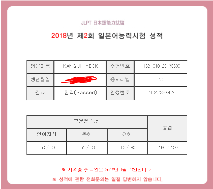 단순한 흥미로 시작했던 일본어 공부를 넘어서 자격증에 도전해 보기 위해 작년 12월 시험 합격을 목표로 수강을 시작했습니다. 아주 약간의 기초가 있었던 덕분에 김수빈 선생님께서 진행하시는 N3 준비반으로 들어올 수 있었고, 성실히 출석하지는 않았지만 한 번 들을 때 완전히 자신의 것으로 만들자는 각오 하에 수업을 들은 결과 이번 N3 시험에 180점 만점 160점으로 합격할 수 있었습니다. 20점이 날아간 것은 제 성실도의 문제가 컸던 것 같아 조금은 아쉽지만 김수빈 선생님께서 청해의 기술과 독해의 포인트를 잘 잡아 주신 덕분에 언어지식과 독해, 그리고 청해까지 모두 각각 50점 이상씩을 얻을 수 있었고 청해에서는 59점을 따내는 쾌거를 얻게 되었습니다. 이 글을 보고 계신 여러분들 중 혹시 JLPT 공부에 도전하는 것을 고민하시는 분이 계시다면 , 망설임 없이 김수빈 선생님의 강좌를 추천드립니다. 4시간(종합반 수업 진행 시간)이라는 긴 시간을 루즈하지 않게 잘 이끌어 주시는 분이니 믿고 다니셔도 될 것 같아요 ! 다시 한 번 좋은 성적을 낼 수 있게 해 주신 김수빈 선생님께 감사드리며 후기를 마칩니다.